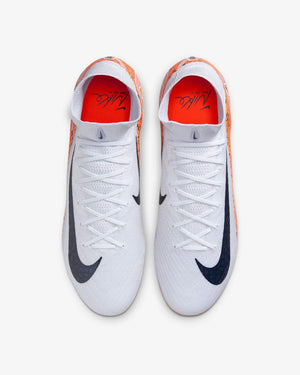 A Nike Air Zoom Mercurial Superfly 10 Elite FG - Electric Pack é a escolha dos jogadores mais rápidos e decisivos do mundo. Parte da exclusiva Electric Pack, essa edição especial combina tons vibrantes de branco, azul-marinho e laranja com um design marcante inspirado na energia e intensidade do jogo moderno. Desenvolvida com as tecnologias mais avançadas da Nike, esta chuteira Elite é idêntica à versão utilizada pelos atletas profissionais nos gramados mais competitivos.